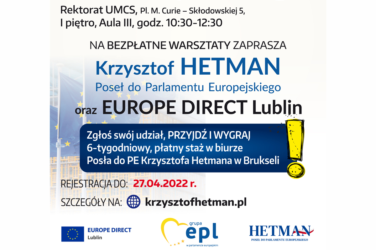 „Staże i praca w instytucjach UE – instrukcja obsługi” to warsztaty, na które zapraszam wszystkich studentów i absolwentów lubelskich uczelni oraz młodzież ze szkół średnich naszego regionu! Warsztaty odbędą się 28.04.2022 r. o godz. 10:30 w Auli III, na pierwszym piętrze w budynku Rektoratu UMCS, pl. M. Skłodowskiej-Curie 5, a ich celem jest przedstawienie młodym ludziom możliwości odbywania staży i aplikowania o pracę w różnych instytucjach Unii Europejskiej. Uczestnikom warsztatów przekazane zostaną praktyczne informacje dot. procedury aplikowania o staż/pracę, jak również postaramy się zwrócić uwagę na umiejętności, kompetencje nad jakimi należy pracować i na co postawić w swojej edukacji aby zdobyć pracę w instytucjach europejskich.